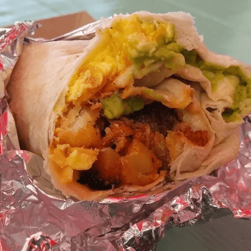 Biscuit, bacon, eggs wrapped up in a warm tortilla with our white sausage gravy