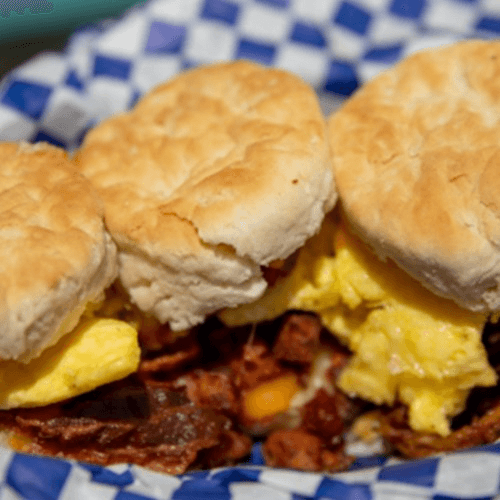3 Buttermilk biscuits, Kalua Pork, Bacon, Portuguese Sausage, Egg, & Cheese.