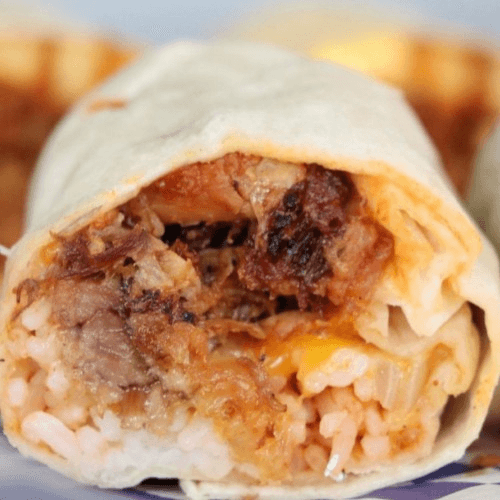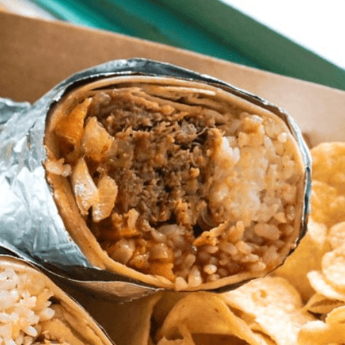KALUA PORK, GUAVA BBQ SAUCE, & WHITE RICE in a tortilla with cheese, grilled onions, and a side of Maui Onion Chips.