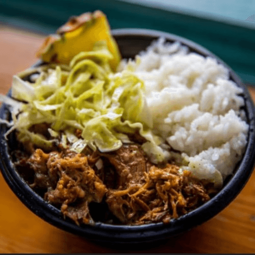 Kalua pork & cabbage mix, papaya seed dressing, white rice, side guava BBQ sauce.