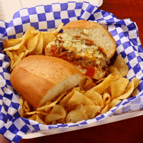 Kalua pork, guava BBQ sauce, grilled onions, & slaw on a french roll with Maui onion chips. Voted best sandwich in Hawaii by Food & Wine.