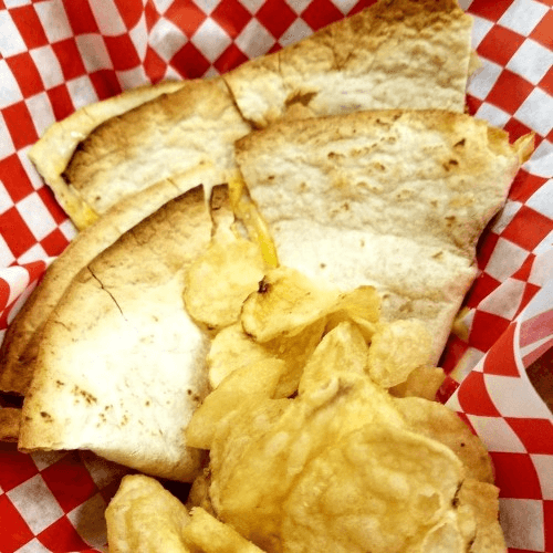 A tortilla filled with cheese, with side salsa, Maui onion chips & a drink.