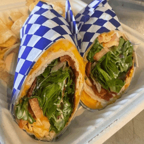 Turkey, bacon, salad greens, cheese, tomato, ranch dressing in a tortilla with side Maui onion chips.