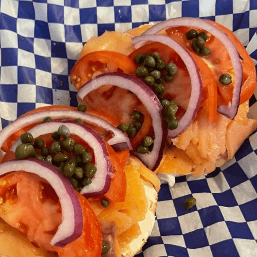 Smoked Salmon, cream cheese, red onion, tomato, & capers on an everything bagel.