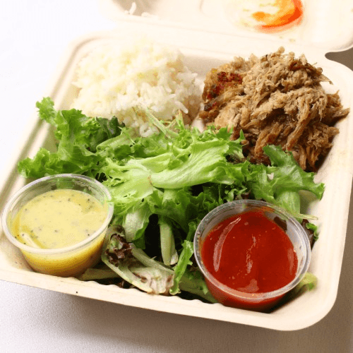 Kalua pork, white rice, salad greens, side guava BBQ sauce & Papaya seed dressing.